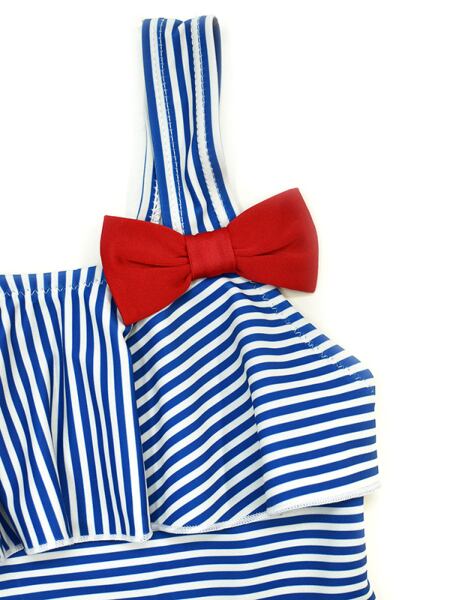 ストライプ柄と、肩ひもに付いた真っ赤なリボンが可愛らしいデザインです。