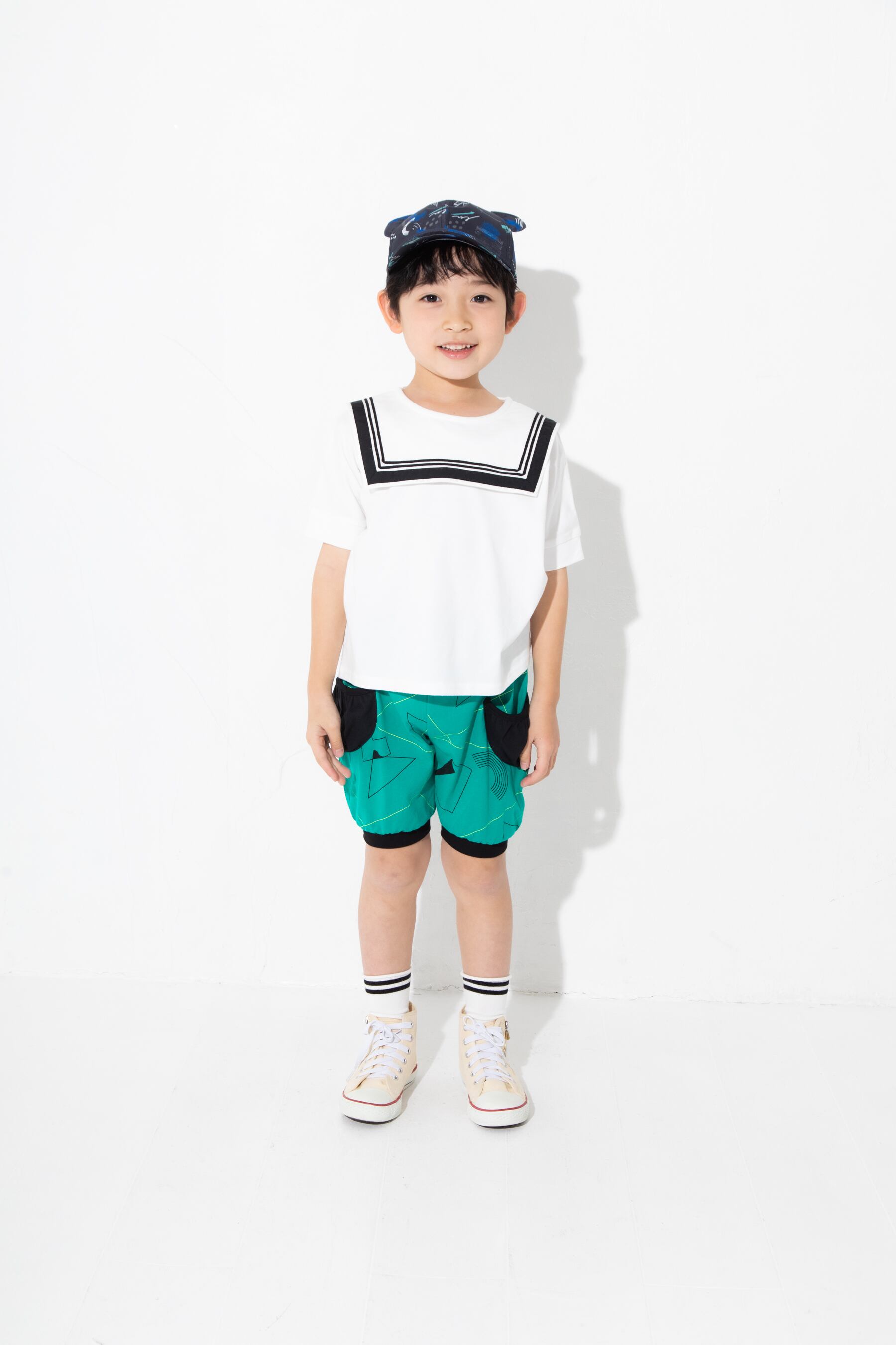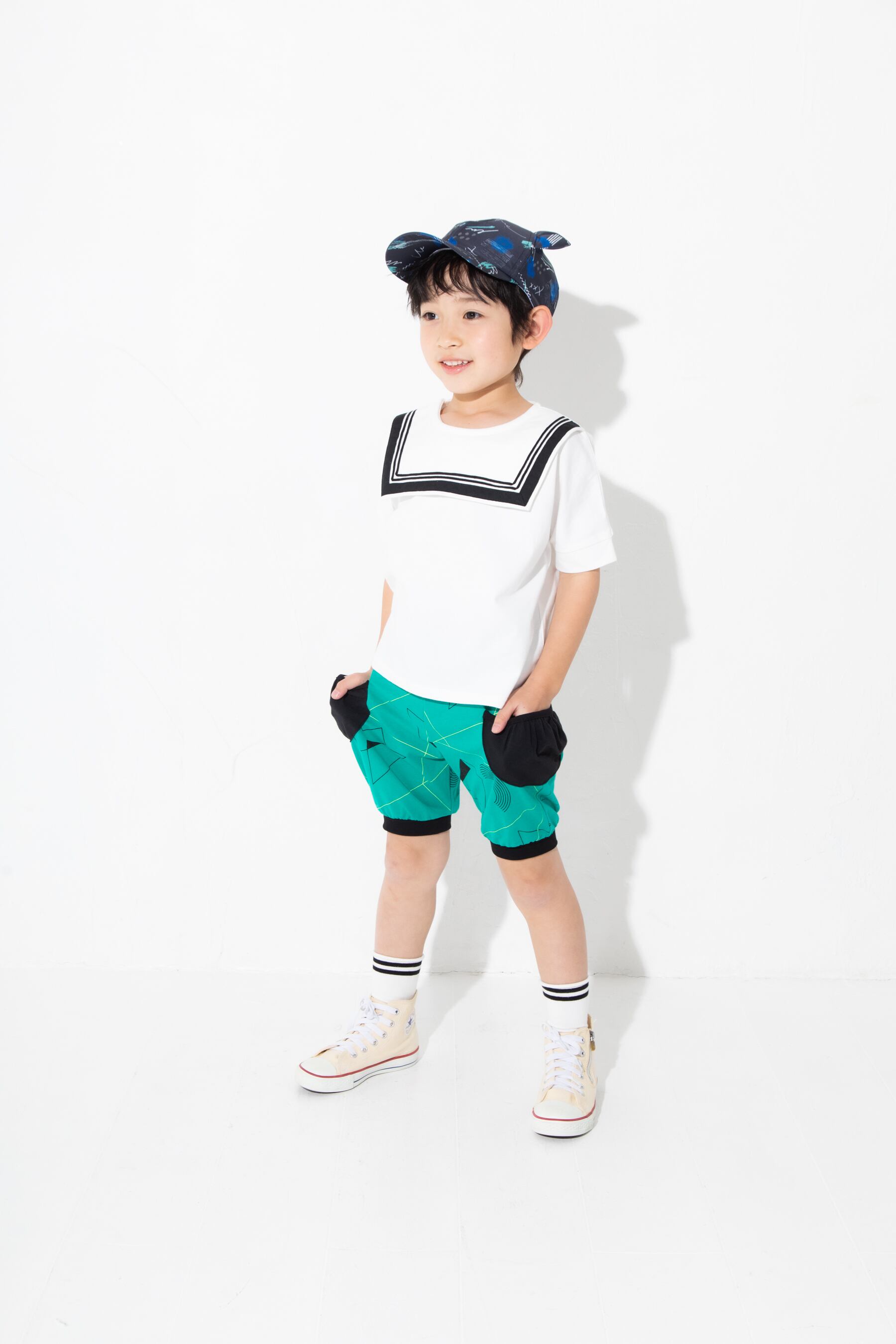 「小さな大人服」をコンセプトに、個性的なデザイン・独特のシルエット・独自のプリントテイストのキッズウェアを展開するブランド“minau”の、ユニークな柄のハーフパンツ。